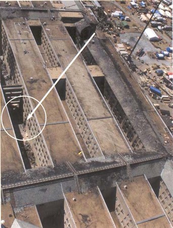 Cette photo montre la partie du bâtiment touchée par le Boeing. On observe que seul le premier anneau a été touché par l’avion. Les quatre anneaux intérieurs sont intacts, ils n’ont été endommagés que par l’incendie qui a suivi l’attentat.