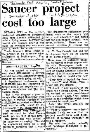 La défense Canadienne confirme à la presse que le Canada avait tenté de construire une soucoupe volante, mais avait abandonné le projet car les coûts n’étaient pas justifiés. Le ministre du commerce en parle dans une interview en Angleterre. Seule une infime fraction du budget a été dépensée car cela n’en valait pas la peine. Le Canada s’est prouvé que l’engin pourrait voler, mais il n’a jamais volé, il n’a jamais quitté le sol, et le ministre pense qu’aucun autre pays n’a jamais pu faire voler de soucoupe volante.