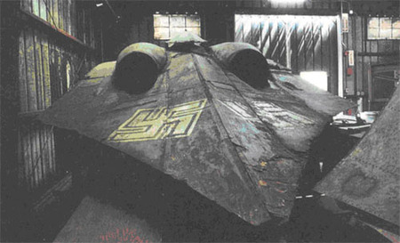 Le chasseur bombardier biréacteur Horten IX V3 (vue arrière et verrière en position arrière)dans un hangar de Silver Hill, Maryland.