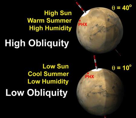 L’obliquité de Mars peut modifier la position des Pôles par rapport à l’équateur (entre 25 et 70% d’obliquité), si bien que la calotte glacière peut être amenée à fondre et à augmenter la pression atmosphérique : il peut alors neiger sur l’équateur !